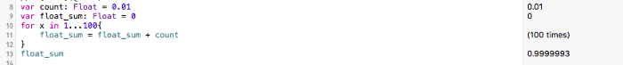 아래의 예시를 보시면, 0.001(Float 타입)을 100번 더하도록 만들어 둔 코드가 있습니다. 우리 상식으로 생각하면 총 합이 1이 되어야겠죠? 그런데 결과를 보면 그렇지가 않습니다. Float(이진타입)의 경우 0.01의 값을 정확히 표시하지 못하기 때문입니다.