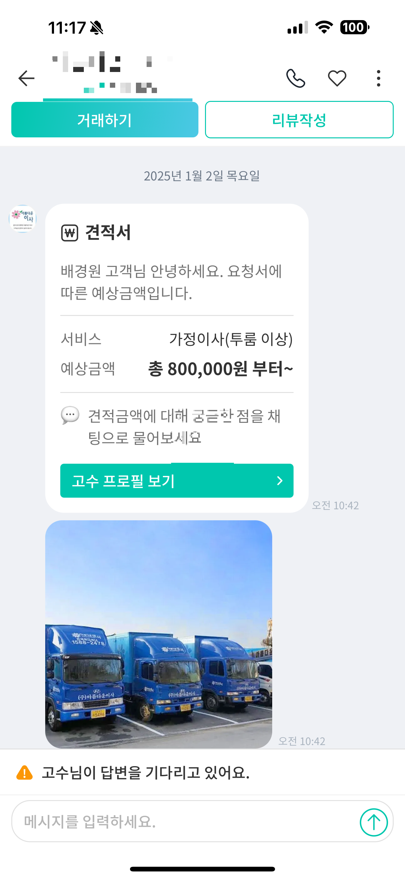 그리고 리뷰를 봅니다.. 저는 고민 많이 하다가 마지막 업체(사진 보면 제가 답장보낸 업체)에 연락을 했어요. 개인이 운영하시는 작은 곳이었고(보통 이름으로 견적옴) 리뷰가 진심 낭낭하게 들어가있어서 고민 많이 하다가 선택하게 되었어요. 비용은 70만원이었어요. 사다리차 별도로 하니까 85만원 나왔는데, 제가 전날 짐싸놓은거 빼고는 거의 포장이사처럼 옮겨주셔서 (내린 곳에는 가구 없어서 그냥 두긴 했지만) 편했어요. 다시 해도 그 가격 낼거같네요.